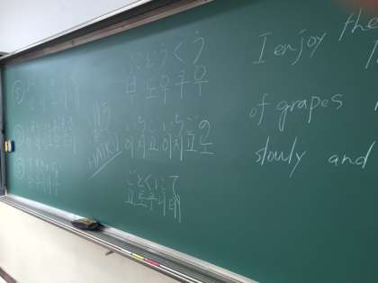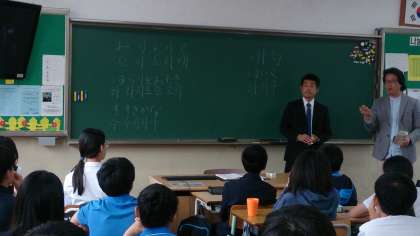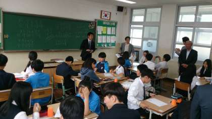 西垣教諭と4限目に授業を行う山田教諭ともに、同行しているコリアNGOセンターの金光敏ソンセンニム(先生)が、両教諭の通訳をしていただいています。