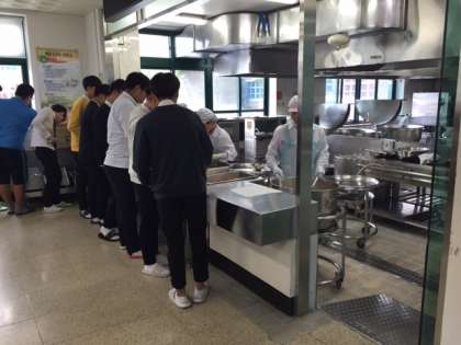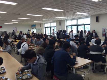 4限目が終わった後は、海美中学校の給食を一緒にいただきました。学年ごとに食堂まで足を運び、プレートを持って給食調理員さんに盛り付けてもらいます。そして座席に着いて、食べはじめます。