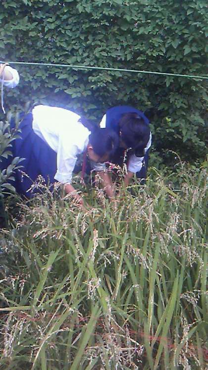 本日は、待ちに待った稲刈りです。この二人は、鎌で稲を刈っています。