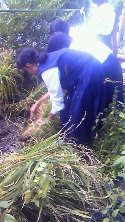 抜いた稲の泥をとっています。