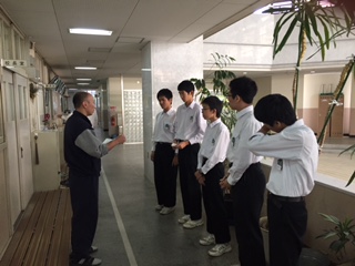 写真は各クラスの男子学級代表が、講師の先生をお迎えにあがっているところです。