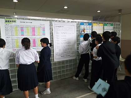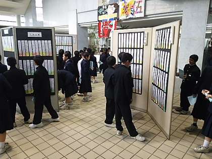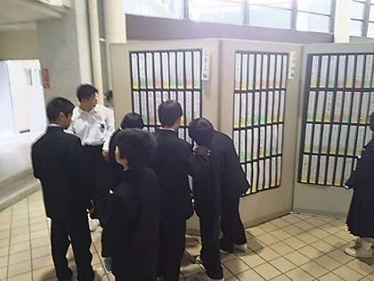玄関ホールでは、国語の作品が並んでいます。先輩たちの作品が気になるようです。