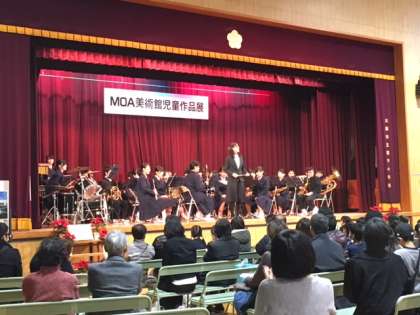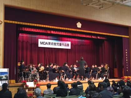 本日吹奏楽部は開平小学校にて行われていた児童作品展の表彰式にて演奏をしました。展覧会を見にきていた方々にも演奏を聴いていただきました。写真は演奏の様子です。