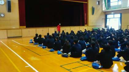 舞台上に学級代表があがり、全員の指揮をとって学年集会が始まりました。