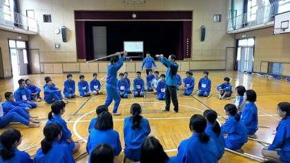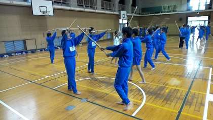 二人一組になって、正面素振りや跳躍素振りの稽古をしています。