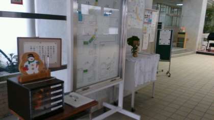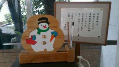 東中ホール入口に、管理作業員の中野さん手作りの、雪だるま東中生が、来校された方々をお迎えしてくれています。