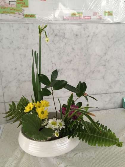水仙、サザンカ、小菊、タマシダなどが使われています。