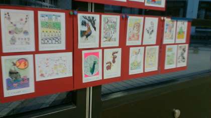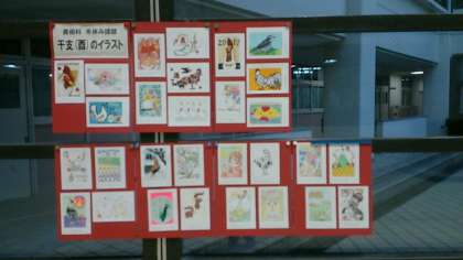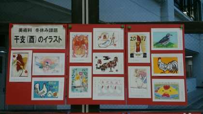 東中ホールには、美術科の冬の課題になっていた干支(酉)のイラストが展示されています。