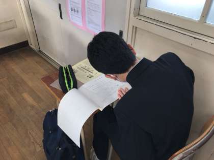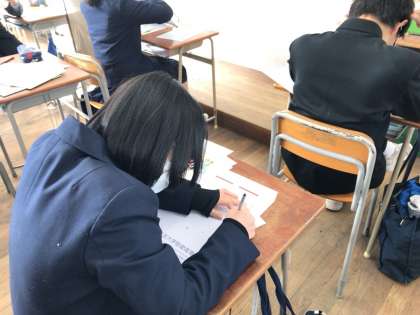 本日1限の3年生の様子です。先週に引き続き、願書の作成を行なっています。下書き、清書が終わった生徒は、公立入試に向けての自己申告書の作成もしています。