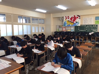 本日1月28日、東中学校を準会場として、今年度2回目の漢字検定を行なっています。2級から5級までの受検者が集まって検定に臨んでいます。