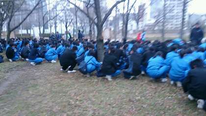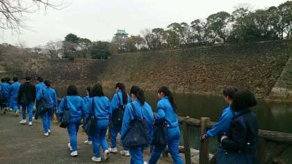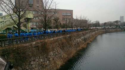 大阪城公園に移動し、マラソンコースに到着しました。雨がパラパラと降りだしましたが、もうすぐ男子スタートです。