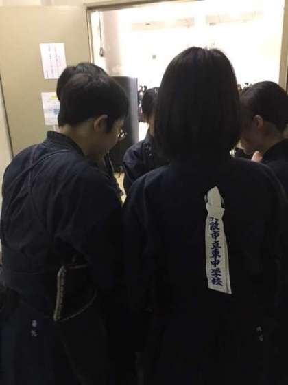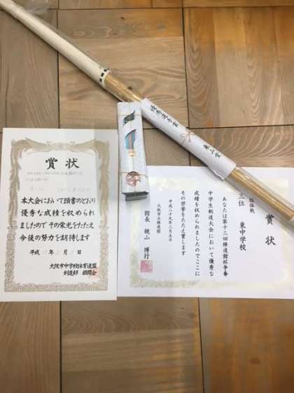 本日、大阪城内修道館において第13回修道館杯争奪中学生剣道大会(平成28年度大阪市中学校剣道顧問大会)の男女団体戦が行われました。東中学校剣道部も男女団体戦に出場。男子団体戦は惜しくも1回戦で敗退したものの女子団体戦は大桐中学校、城東中学校、喜連中学校に勝利して準決勝に進出しました。準決勝では菫中学校に敗退しましたが、女子団体戦3位に入賞しました。また優秀選手も1名選出され表彰されました。今回の大会では、これまでの努力の成果が随所に見られ選手たちも「努力の成果と勝利の喜び」を感じることができました。女子団体は次の春季総体ではシード校となります。今日の経験を糧にシード校として恥じないよう厳しい稽古に励みたいと思います。