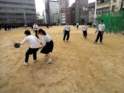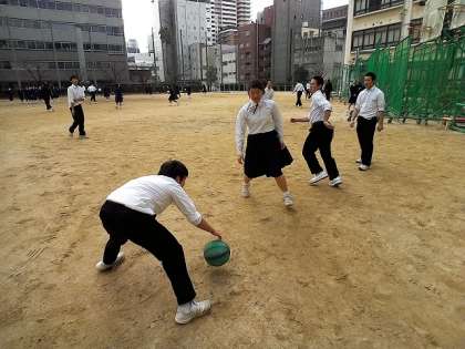 今日の昼休み、気温も8度を下回る中、上着を脱いでかなり真剣にバスケットボールをしている東中生を発見!