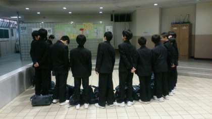 男子バスケットボール部が練習を終え、ミーティングのため、東中ホールに集合しています。男子バスケットボール部は先週の土曜日の公式戦2試合に勝利し、今週末に次の試合に挑みます。