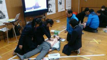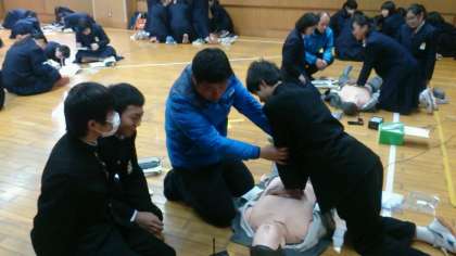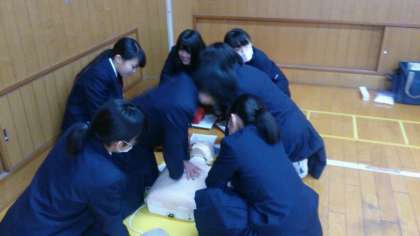 2年生の保健体育科保健分野では、「応急手当の意義と方法」の単元の学習で、心肺蘇生用人形(ジャミーちゃん2号)を活用して、実際に心肺蘇生法の練習をしています。