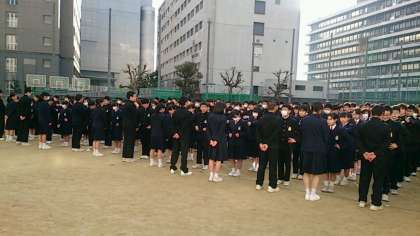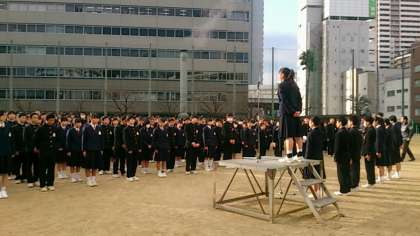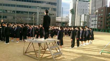 今日は昨日までの寒さが少し緩み、太陽の光も差し込む中、運動場で全校集会を行いました。生徒会の皆さんは、マイクを通さず、地声で集合整列の合図や連絡事項を伝えてくれています。また、部活動部長会からは、あいさつについて、今後の取り組みについて、確認してくれました。
