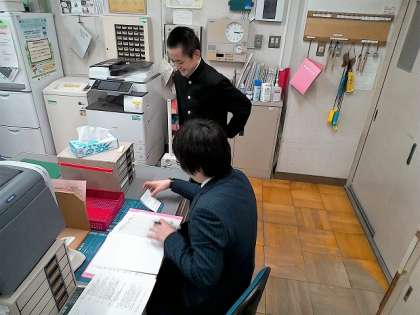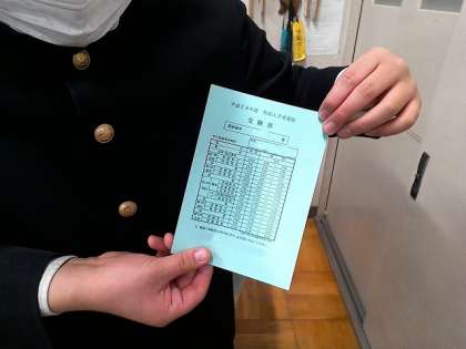職員室の先生に受検番号を報告して、今後の指示を受けていました。