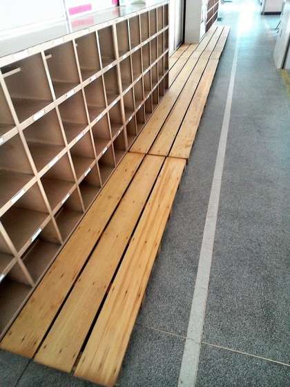 図書室や美術室などの下駄箱前には、体育館シューズに履き替えるためにすのこが設置してあります。