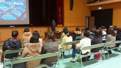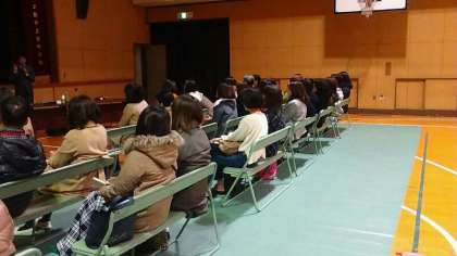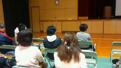 保護者の方が自分の携帯を片手に講演を聞いています。