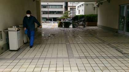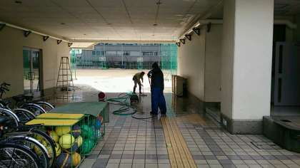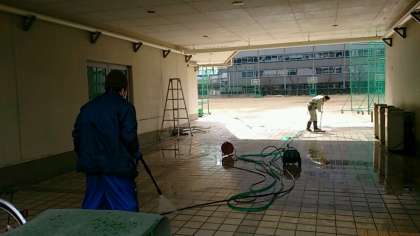 東中生が下校した後、寒風が吹くなか、管理作業員さんがピロティの大掃除をしてくださっています。こうして東中生の学習環境を整えていただいていることに感謝し、私たちの東中を大切にしていきましょう!