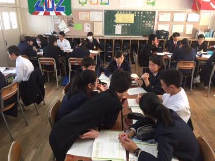2年生の英語の授業ではC-NETの先生の手本を参考に自分の町の紹介を行いました。