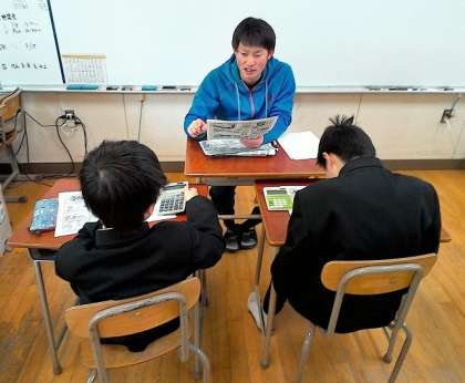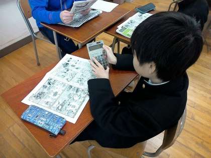 新聞の折り込み広告を使って、買い物をするときに代金をいくら払えばよいかを計算するという内容です。