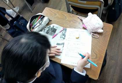 生徒たちは、ワークシートを使って作者の心情を自分に当てはめて考えていました。