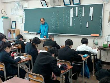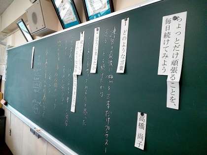 1年3組では、西邨先生が高橋尚子さんの読み物を使って授業をされていました。