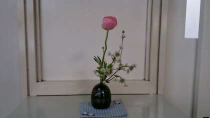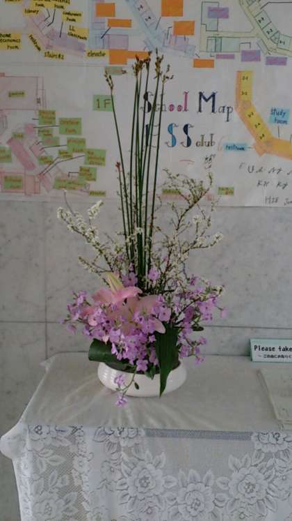 中段の写真は、「巣立ちの朝」というタイトルで、卒業式の朝に合わせて生けていただきました。3年生は、花々に見送られ、東中を巣立っていきました。