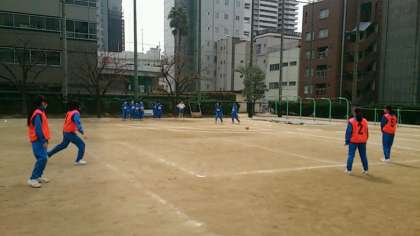 春の風を感じる清々しい日、運動場では、2年生が体育の授業で、キックベースボールに取り組んでいます。明るい笑顔、楽しそうな声が、響いています。