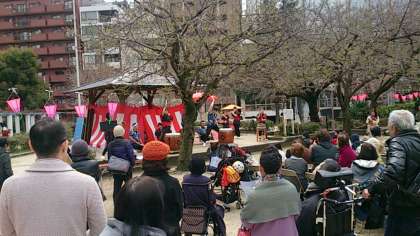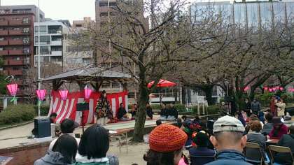 4月1日(土)、中大江公園にて桜まつりが開催されました。さくらはまだ満開ではありませんでしたが、山本能楽堂の皆さんによる能の披露や和太鼓の演舞、そして、お茶会と、楽しい一時を地域の皆さんと過ごすことができました。