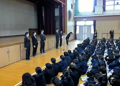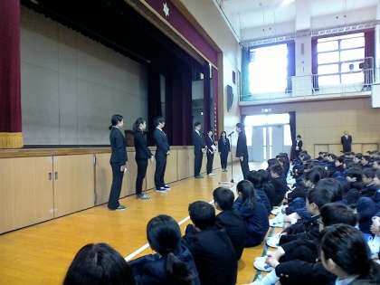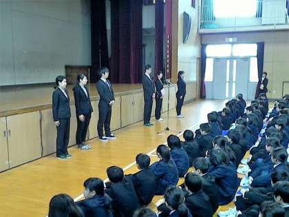 全校生徒への紹介と、代表生徒のあいさつの様子です。