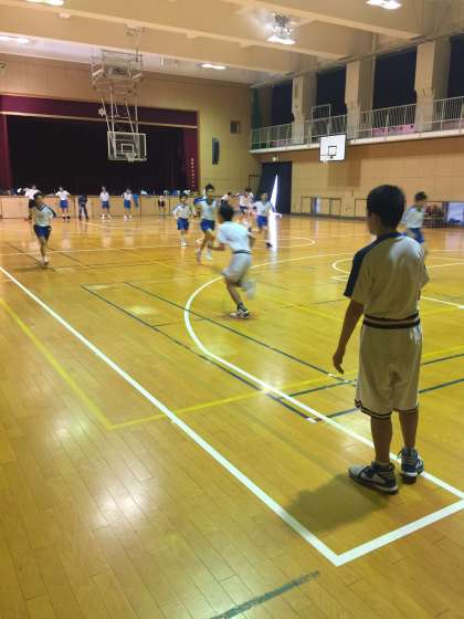 男子バスケットボール部練習の風景です。1年生は初めての土日の活動に参加しています。2年生が丁寧にフットワークやハンドリングを指導しています。3年生は明日の試合に備えて心身ともに最終調整中です。