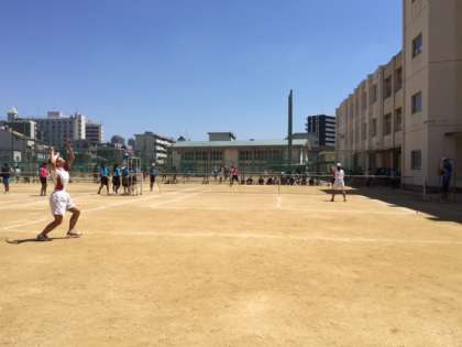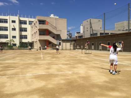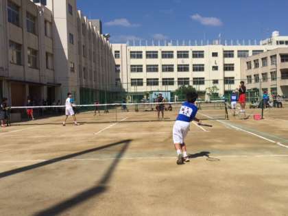 晴天のなか、各ペア全力でプレーしています。