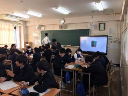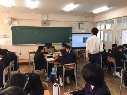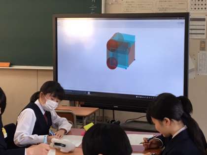 電子黒板を利用したICT授業を行なっています。立体の体積を求める問題で、イメージをつけやすいように、動画を映しています。