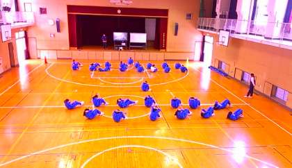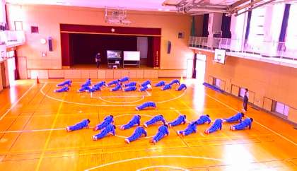 体育授業の最初の10分間に体育委員の号令で行う東中のトレーニングを覚えるため、ICTを活用して視覚的に理解して一生懸命に取り組んでいます。