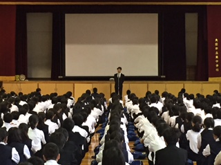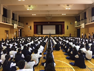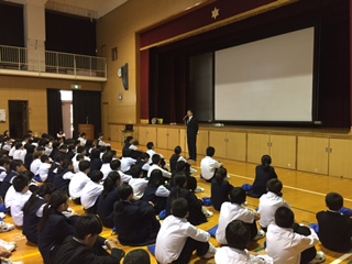 「いじめは絶対に許すことはできない!自分を、そして仲間を大切にしてほしい!!」の内容でのお話の冒頭には、いじめを受けた児童の手記や、少年時代にいじめを受けた方が、そのいじめから救ってくれた同級生、現在ニューヨークヤンキースの投手である、田中将大(マー君)選手の少年時代のお話のご紹介がありました。