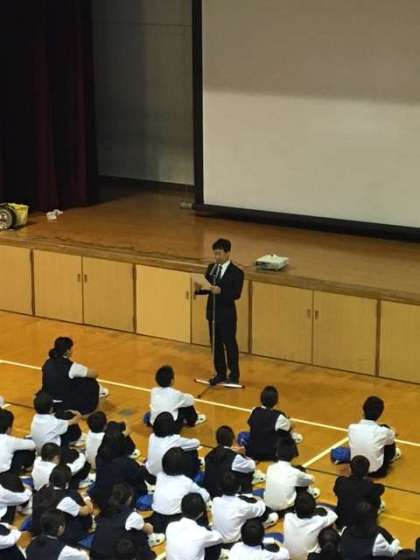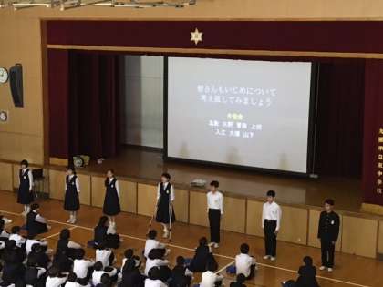 いじめについて考える日の取り組みとして東中学校では、校長先生、生活指導主事の西垣先生からお話があり、生徒会によるいじめアンケートの結果などの発表がありました。
