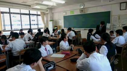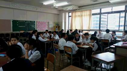 先週からスタートした班活動。本日は班会議で学級目標達成に向けて班で何を実践していくか、話し合っています。