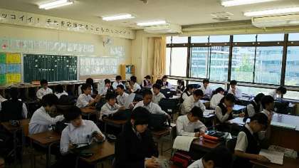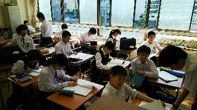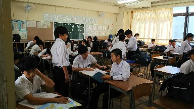 中間テストの朝、始業までの間も勉強に専念しています。友達と問題を出しあったり、教えあったり、素晴らしい光景ですね。