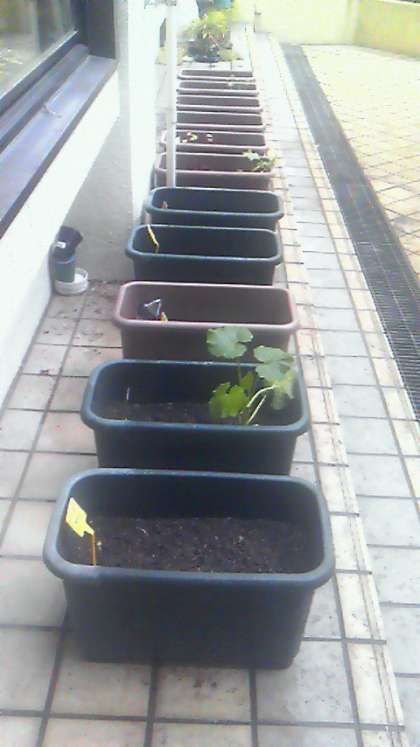 11人分のプランターも1回目の植え付け完了しました。(何もないように見えますが、どのプランターにも何かが植えられています。)