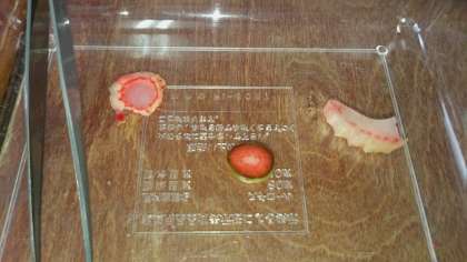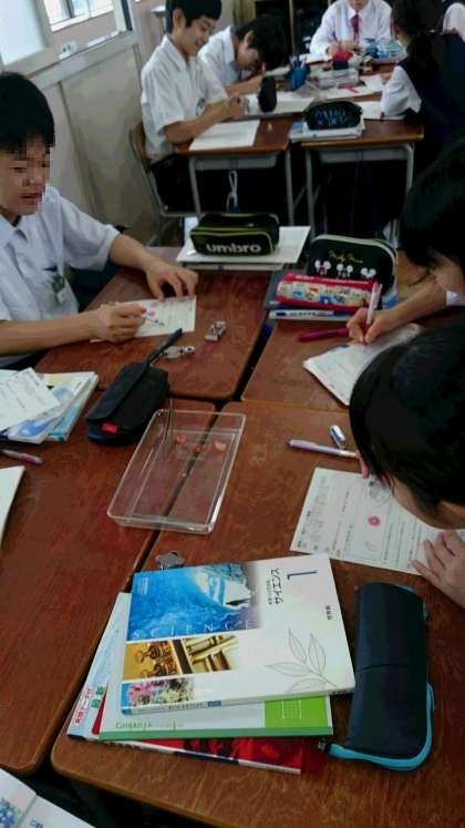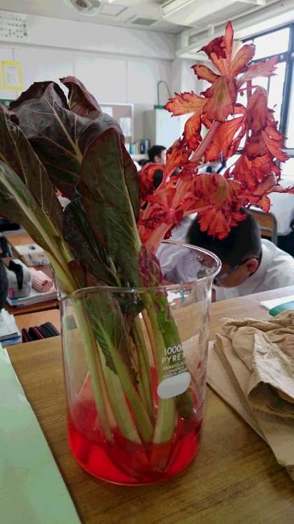 本日は、赤い水を吸わせた茎の断面を観察して、水が茎の中のどこを通っているかを学習しました。写真の茎の断面は、右からセロリ、アスパラガス、コマツナです。道管が赤く染まっているのが観察できました。スケッチをして、道管の分布の共通点と相違点を考えました。