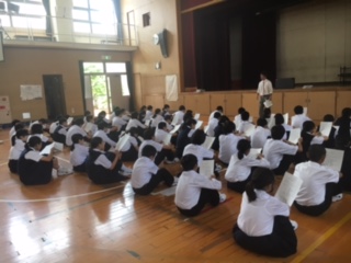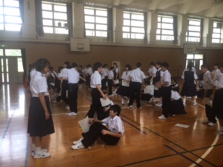 本日より、昼休みに一泊移住へ向けて1年生の各係が集まって、整列の練習をします。第一回目は班長と副班長です。素早く整列ができるように全クラスを想定して頑張っています。