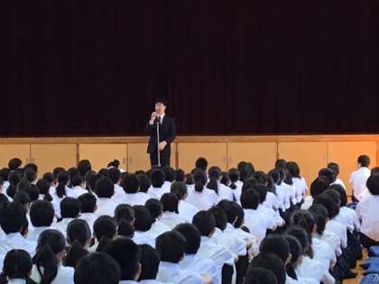 1点目は、春季総合体育大会に予選を突破して出場した剣道部、ソフトテニス部に労いのお言葉をいただきました。また、他の部活動においても練習試合や合同練習会等、活発に活動している部活動に、目標に向かって日々努力し、仲間と切磋琢磨して、自分をチームを磨いていくことが大事。もちろん結果が伴えば達成感も満足感も得られるかもしれない。しかし、それは努力の大きさ、あきらめない気持ち、仲間との協力や励まし合いといったことが何よりも大切なこと。今日からまた新しい目標に向かって頑張っていきましょう!