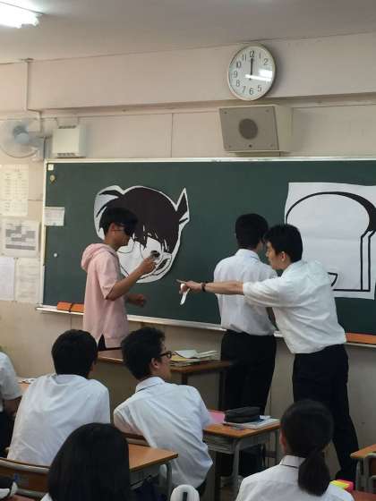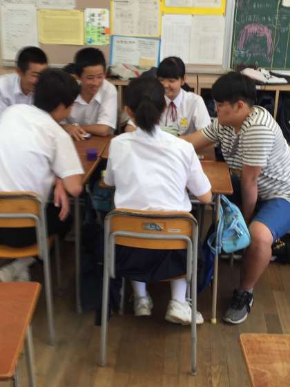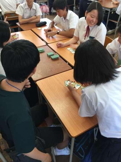 こちらは坊主めくりや福笑いの光景です。東中学校のみんなも海美中学校のみんなも楽しそうです。
