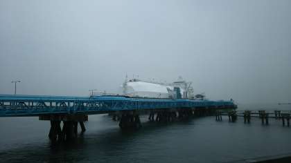バスに乗って工場内を見学しています。あいにくの天気ですが、最新型のタンカーが停まっているのを見ることができました!このサヤエンドウ型が最新なのだそうです。