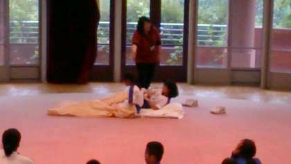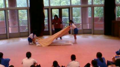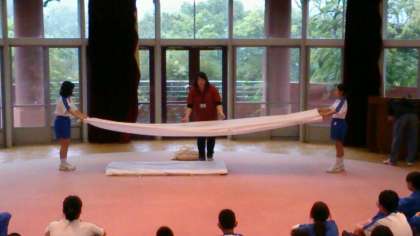 職員の方から、布団の敷き方についての説明をいただきながら、代表生徒によるシュミレーションです。