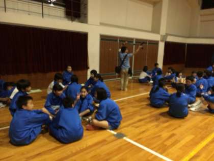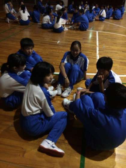レクリエーションの開始です。まずは班で「英語をしゃべってはいけないゲーム」をしています。言葉が標準語になったり、カタコトになったり、とても気をつけながら会話を楽しんでいます。