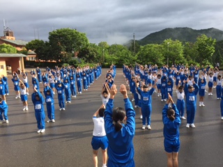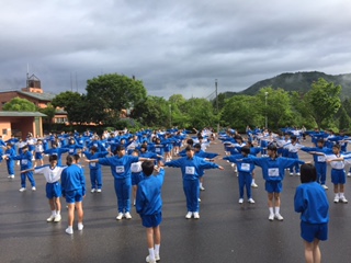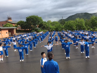 全員で取り組む東中体操に、同じ日に宿泊していた小学生も注目していました!