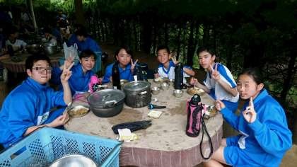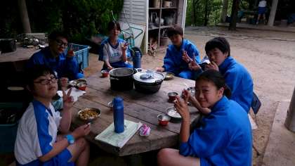3組です。火が足りない!、水入れすぎた!色々トラブルが発生。でも、マキの余りをもらいに行くよーと走る人、自分の班は手が足りてるからと隣の班を手伝う人、全クラスにゴミの回収の声かけをしてまわる人、みんなが自分の仕事を見つけて協力し、見事リカバー。美味しいカレーができました。